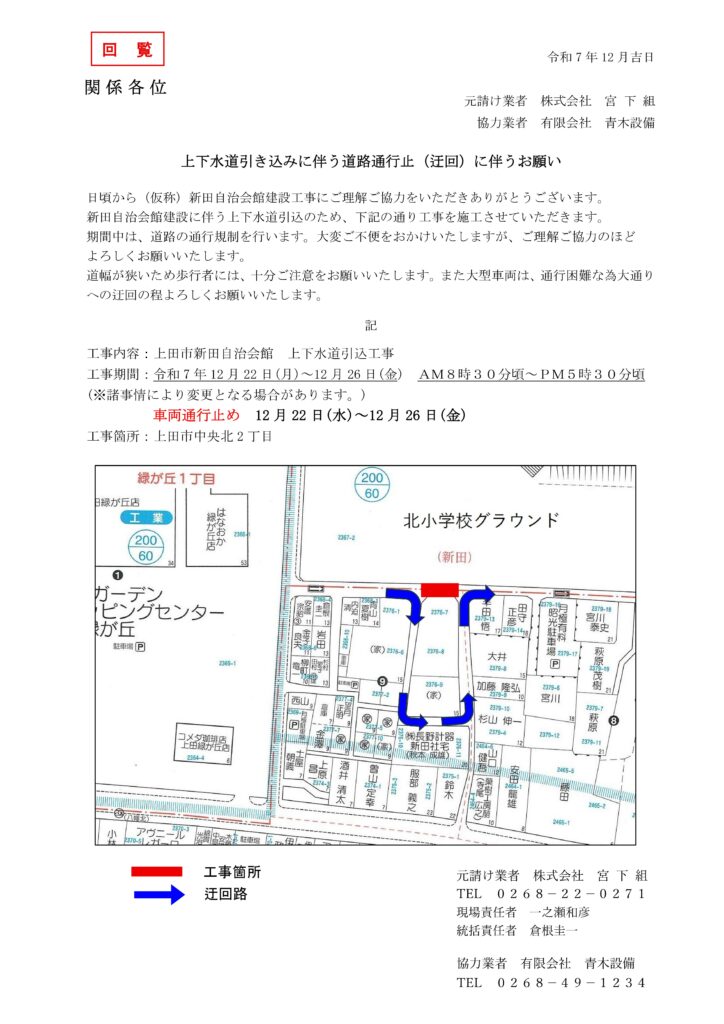 • 新田自治会館建設に伴う道路通行止めのお知らせ